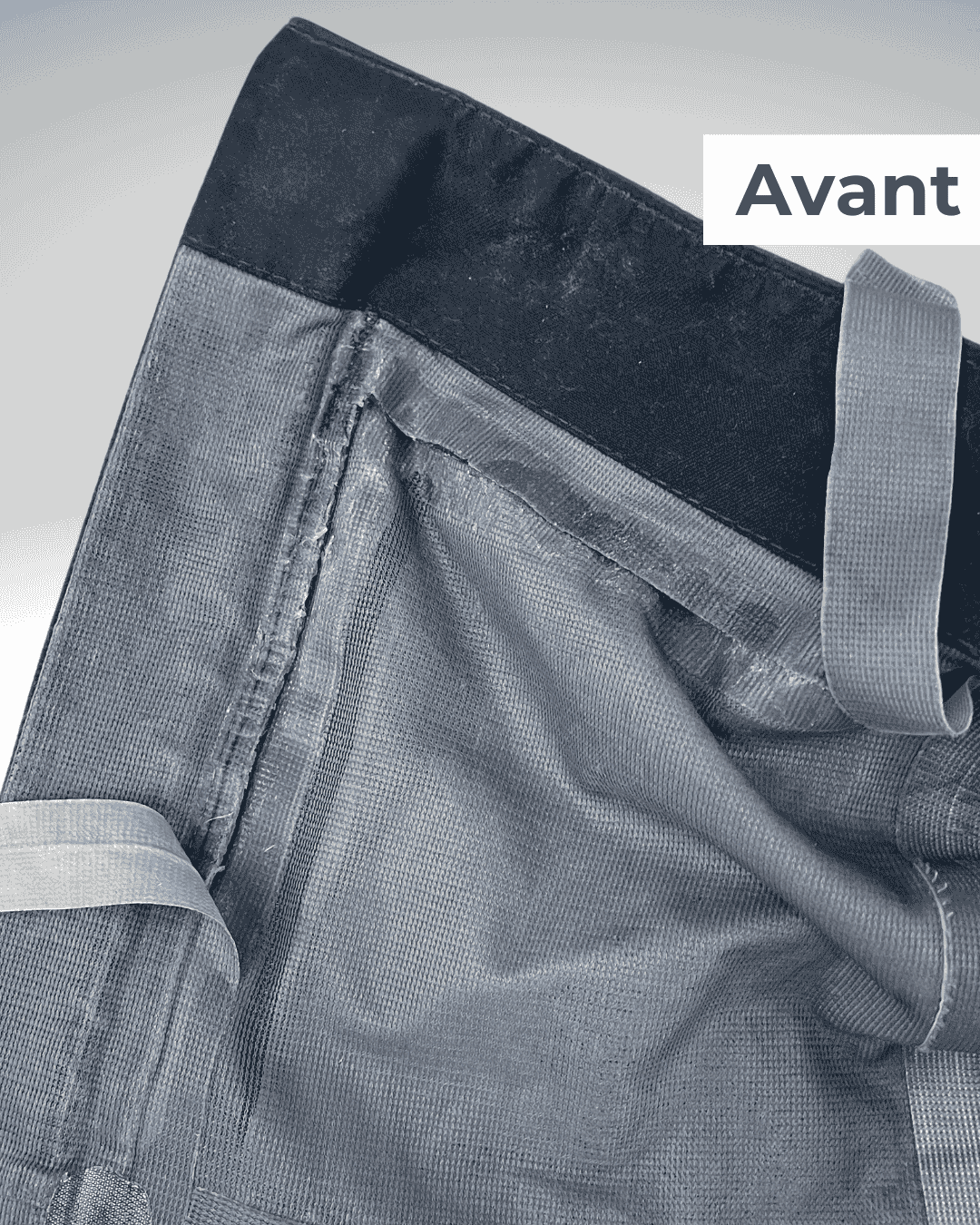 Avec le temps, les frottements ou la transpiration, ces bandes finissent par se décoller (le fameux “tape” qui pendouille). Résultat : l’eau s’infiltre, même si le tissu extérieur est encore bon. Chez Goodloop, nous ne nous contentons pas de “recoller” : nous retirons les bandes usées et en appliquons de nouvelles à l’aide de machines professionnelles.